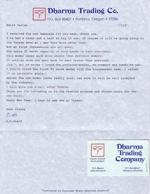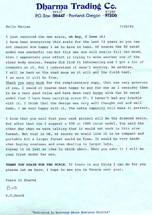From the very first we considered user input to be critical to the design's success. As soon as we had anything to show, we recruited a very well-placed group of individuals we called "Beta People". We were the Alpha people, the first testers. Beta Sites were real gem dealers whom we befriended and subjected to endless questions, ill-designed questionnaires, flaky scales, and lots of love. For their troubles, which were aplenty, they got to use some amazing new gadgets before anyone else did. They also got to keep these scales for free. When the Legal-for Trade fiasco hit Tucson in 2001, we supplied free Legal scales to our Beta people, to use and to keep. We were really very generous with them, but we felt that they were very generous to us with their time. And when the scales (finally) did work, we couldn't have had a better Public Relations Corps. And some great times. Thank you, Betas, one and all. We will indeed miss you.