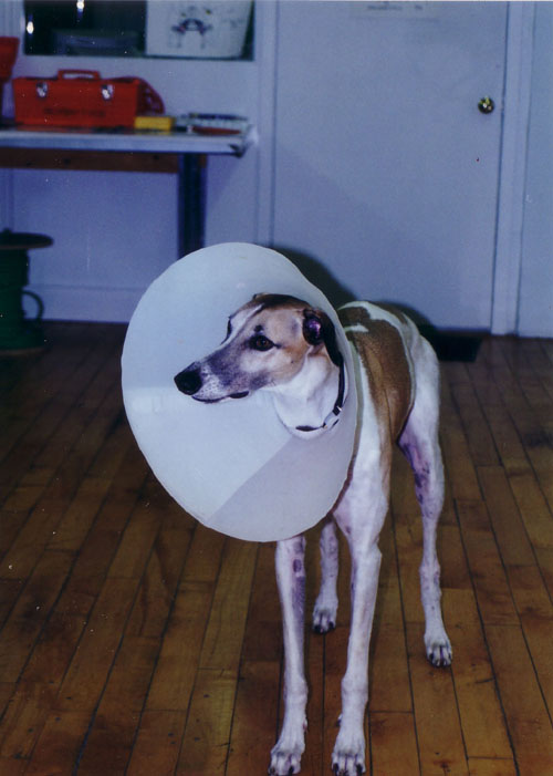 Greyhounds all have thin skin, so it was not surprising that there were a couple of periods when Happy was adorned with so-called Elizabethan Collars. He did his very best to ignore them and look regal. It was not easy. We would tell people he was wearing a radar dish and scanning for booty.