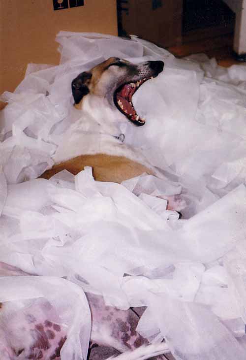Happy's life pretty much paralleled that of Dendritics as a production company. He was born May 24, 1992. Joined us in September 92 as a rare greyhound puppy aged only 15 weeks. Celebrated his 10th birthday in May 2002 and died July 28, 2002. He was a major force in our interviewing process, passing judgment on one and all without concern for political correctness. You had to at least think he was OK, or how could you survive? Irina and her daughter were initially terrified of dogs, but he won them over with his sweet side.