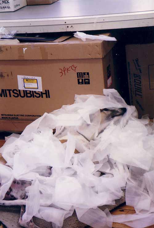 The following 3 are a cute series of Happy engulfed in the special antistatic foam we used for packaging draftshields. In the background are the boxes which Dave the Robot came in.