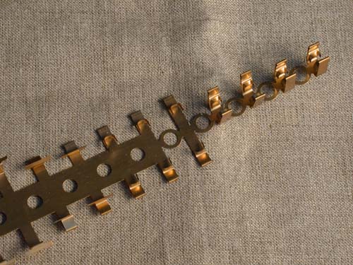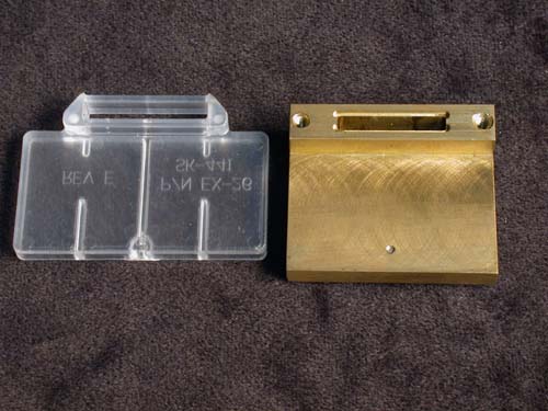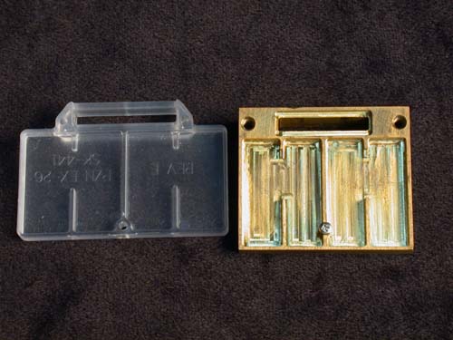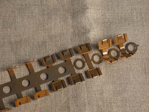 These were brass and (on the left) molded versions of a conductive shield designed to cover the critical circuit oscillator regions. We later discovered a way to avoid using it. After making the mold, of course.